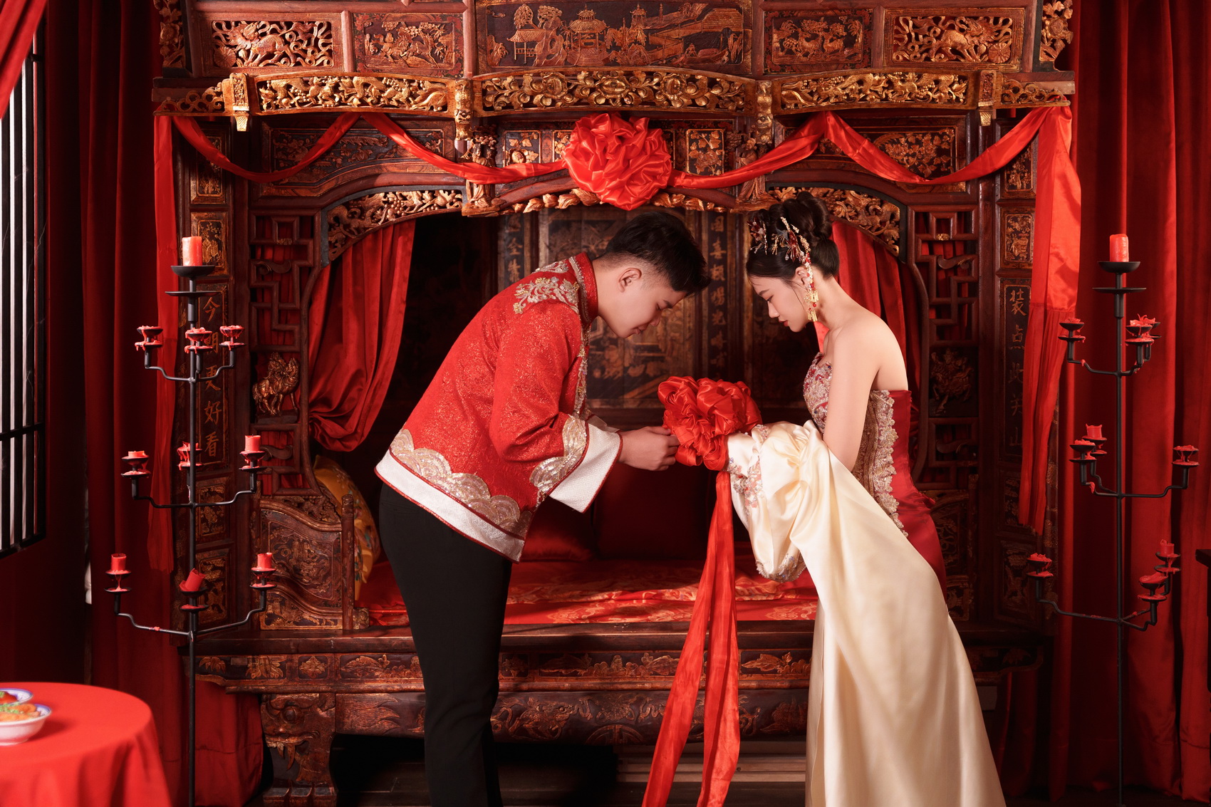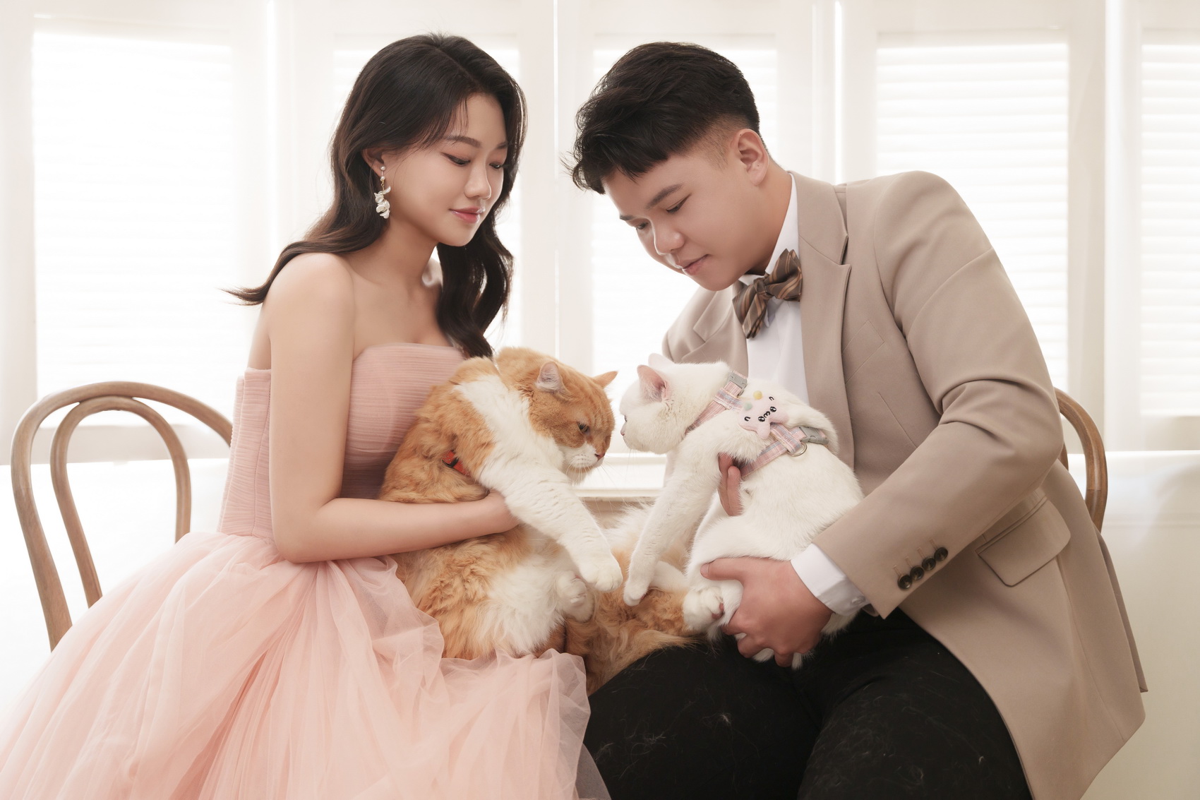 拍攝當天,彩妝師綵穎的巧手幫我打造了非常細緻且自然的妝感,讓我在鏡頭前非常有自信。攝影師偉恩專業的帶位與構圖,配合燈光師旻嘉辛苦地調整光影與裙襬,整個團隊默契十足,把我們互動中最自然、最美的一面都捕捉了下來。